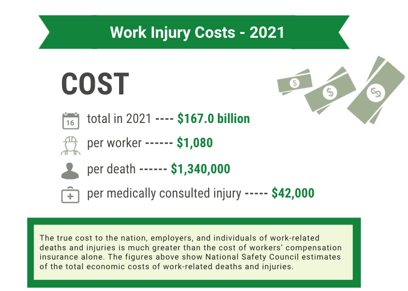 2. The total cost of work injuries in 2021 was $167.0 billion in the US, including wage and productivity losses of $47.4 billion, medical expenses of $36.6 billion, and administrative expenses of $57.5 billion.